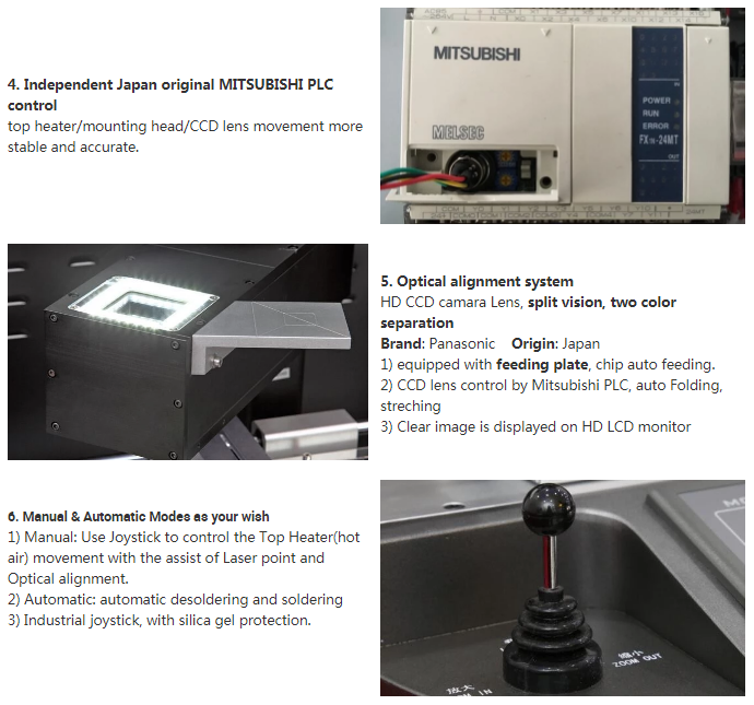 Mar gheall ar dhearadh soladach, cuirtear sceallóga bga ar fáil go beacht agus faigheann sé bás laistigh de 2 mm. Déantar ailíniú ag baint úsáide as optaic fís scoilte a cheadaíonn radharc comhuaineach an fhoshraith agus smeach sliseanna / bás. Tá an dá íomhá forshuite ag baint úsáide as micriméadair ar chéim glais fholús bheacht. Cuimsíonn na bogearraí bunachar sonraí de phróifílí réamhshainithe a roghnaíonn an t-úsáideoir bunaithe ar an bás agus an tsubstaint. Is féidir próifílí a mhodhnú, a bharrfheabhsú agus a stóráil go héasca lena n-úsáid amach anseo. Is féidir socruithe a choigeartú ar an eitilt agus an phróifíl ag rith. Déantar téamh rialaithe ag bogearraí ag an mbás trí Téitheoir Aeir comhiompair.